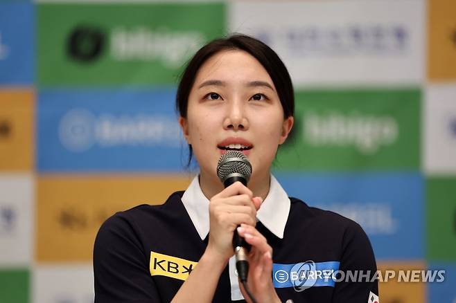 (진천=연합뉴스) 윤동진 기자 = 27일 오후 진천선수촌에서 열린 수영 국가대표팀 미디어데이에서 아티스틱스위밍 이리영이 발언하고 있다. 2023.6.27