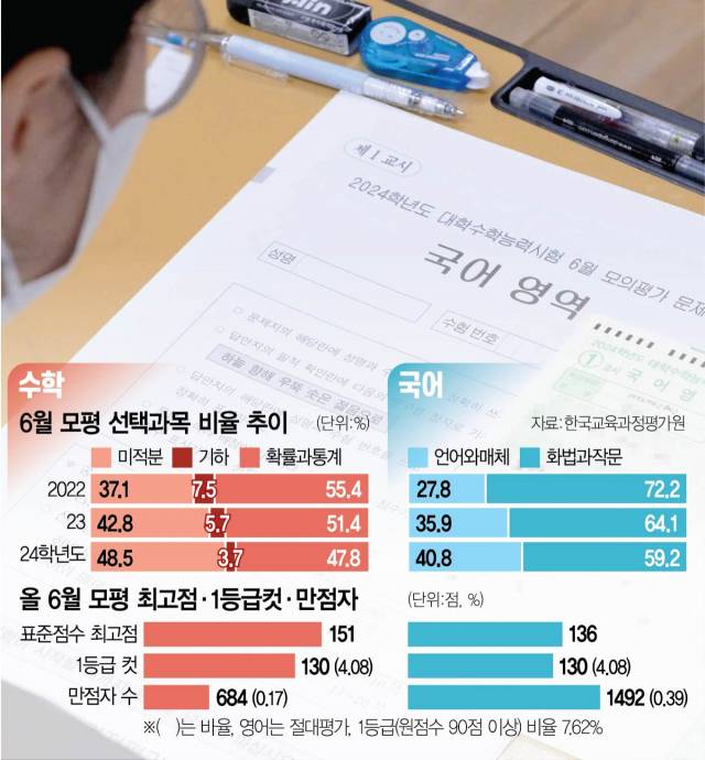 1일 치러진 한국교육과정평가원 주관 2024학년도 대학수학능력시험 6월 모의평가 수학 영역에서 미적분을 선택한 학생 비율이 확률과통계 선택 비율을 넘어선 것으로 나타났다. 통합형 수능 도입으로 ‘공통+선택과목’ 체제가 적용된 2022학년도 수능 이후 처음이다. 입시 관계자들은 앞으로 수능에서 ‘킬러 문항(초고난도 문항)’이 사라질 경우 특정 선택과목 집중 현상이 더 짙어지고 이과생들의 ‘문과 침공’도 더 심화할 수 있다는 전망을 내놓고 있다.