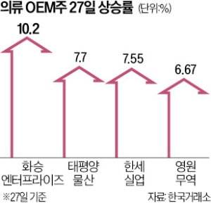 한세실업, 화승엔터프라이즈 등 국내 의류 주문자상표부착생산(OEM) 기업들의 주가가 일제히 급등했다.