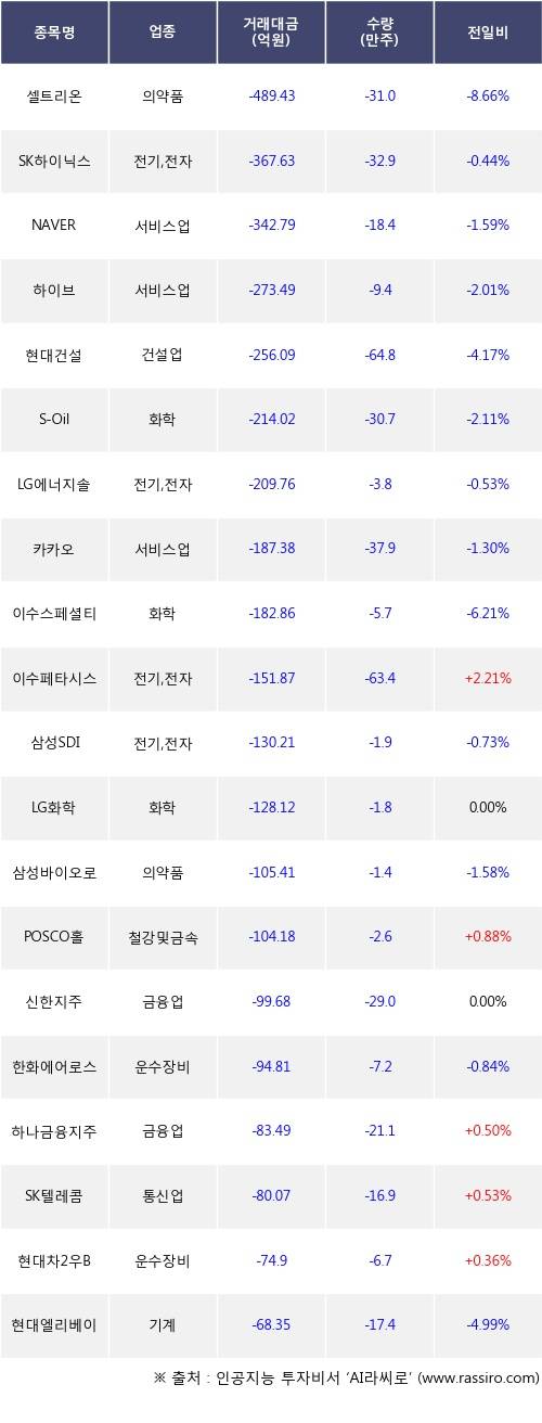 외국인 투자자의 순매도 상위 20개 종목은 셀트리온, SK하이닉스, NAVER, 하이브, 현대건설, S-Oil, LG에너지솔루션, 카카오, 이수스페셜티케미컬, 이수페타시스등이다.