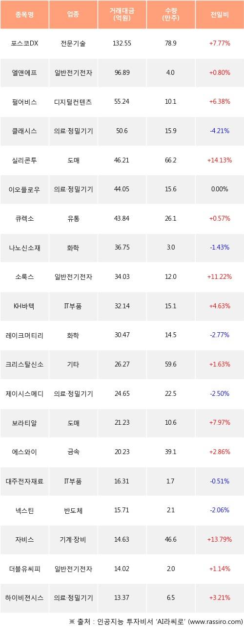 외국인 투자자의 순매수 상위 20개 종목은 포스코DX, 엘앤에프, 펄어비스, 클래시스, 실리콘투, 이오플로우, 큐렉소, 나노신소재, 소룩스, KH바텍등이다.