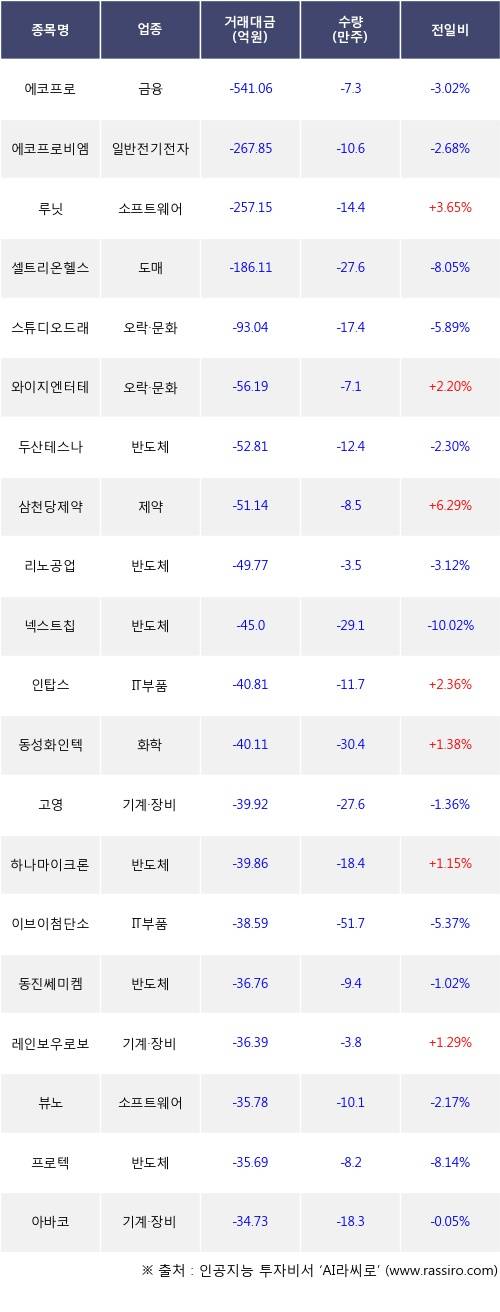 외국인 투자자의 순매도 상위 20개 종목은 에코프로, 에코프로비엠, 루닛, 셀트리온헬스케어, 스튜디오드래곤, 와이지엔터테인먼트, 두산테스나, 삼천당제약, 리노공업, 넥스트칩등이다.