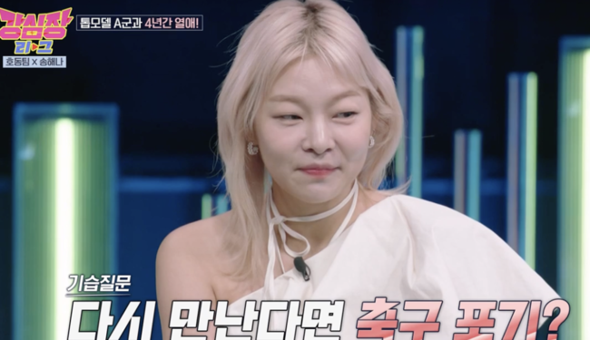 송해나는 “톱모델 A군과 4년간 열애, 결혼까지 생각했다”며 언급, “그 분도 아직 솔로”라고 해 모두 궁금하게 했다. 언제 사귀었는지 묻자 송해나는 “3년 전 ‘골때녀’ 시작할 때 헤어졌다”며 “SBS가 남자친구 뺏어갔다, 우리가 주6회 아침 10시부터 훈련이었기 때문”이라고 했고 모두 “남자친구와 ‘골때녀’ 맞바꿨다”며 놀라워했다.