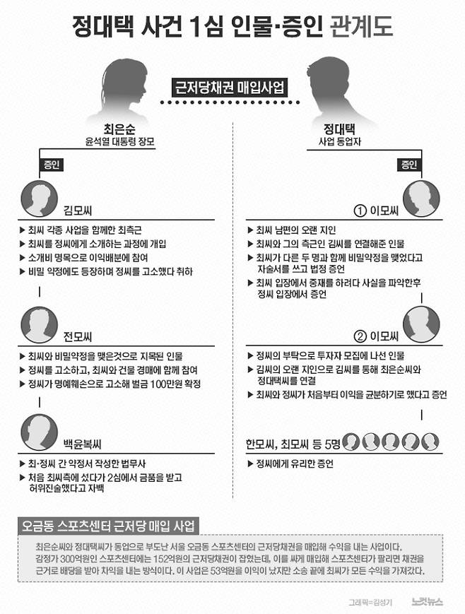 윤석열 대통령 장모인 최은순씨가 동업자 정대택씨를 강요죄로 고소한 사건의 1심 재판에서 "최씨가 정씨 몫을 빼앗기 위한 이중 비밀약정을 맺었다"는 증언이 나왔던 것으로 확인됐다.