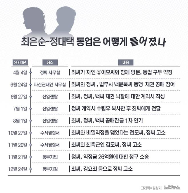 28일 CBS노컷뉴스 취재를 종합하면, 지난 2004년 9월 6일 최씨의 지인인 이모씨①는 최씨와 정씨가 동업한 서울 송파구 오금동 스포츠센터 근저당채권 매입 사업과 관련해 증인으로 법정에 나섰다.