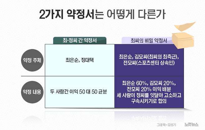 전씨의 고소장에는 최씨와 정씨간 이익을 균등분배하는 내용의 약정서가 첨부됐다. 이 약정서는 최씨와 정씨, 두 사람만 가지고 있던 것이다.