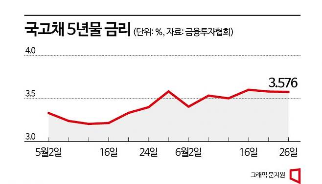 문제는 최근 이 국고채 금리가 다시 오르고 있다는 점이다. 금융투자협회에 따르면 국고채 5년물 금리는 지난해 10월21일 4.638%에서 올해 2월3일 3.096%까지 떨어졌다가 최근 3.5~3.6%대까지 올라왔다. 국채 10년물도 3.6%대다. 이에 따라 5대 시중은행의 변동형 주담대 금리는 지난달 말 연 3.91~6.15% 수준에서 최근 연 4.23~6.12%로 하단 금리가 상승했다.