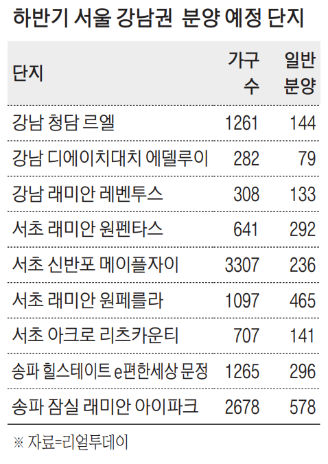 리얼투데이에 따르면 올해 하반기 강남3구(강남·서초·송파구)에서는 9개 단지 분양이 이뤄질 전망이다. 전체 가구수는 1만1546가구고, 일반분양 물량은 2364가구다.