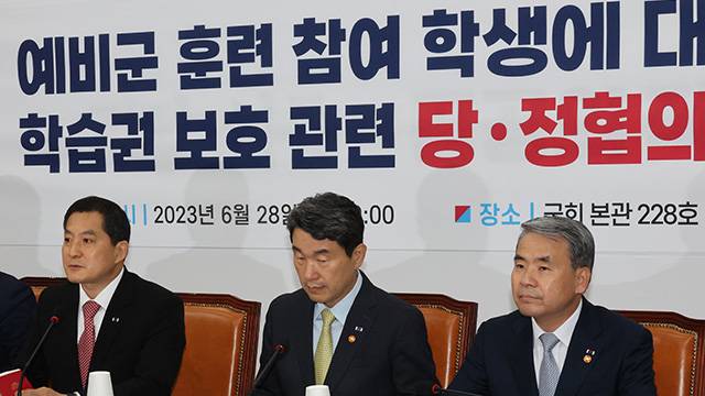 박대출 국민의힘 정책위의장은 오늘(28일) 국회에서 열린 ‘예비군 훈련 참여 학생에 대한 학습권 보호’ 관련 당정협의회에서 “예비군 학습권 보장 방안을 2학기 시작 전에 시행되도록 해서 억울하거나 허탈감을 느끼지 않도록 할 것”이라며 이같이 밝혔습니다.