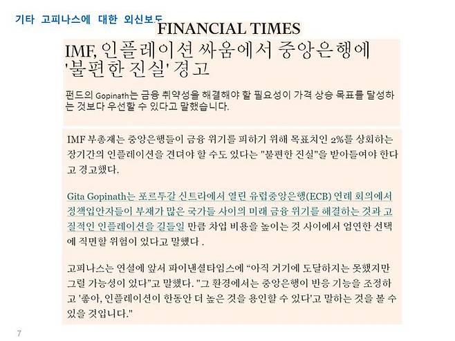 우리 언론에서는 제대로 기사가 나오고 있지 않지만, 지금 ECB포럼에서 무엇보다 주목되고 있는 건 기타 고피나스 IMF 수석부총재의 발언입니다. 지금 대부분의 고피나스 수석부총재 관련 기사는 그녀 역시 "금리인상은 계속돼야 한다"고 말했다는 점에 집중돼 있습니다.