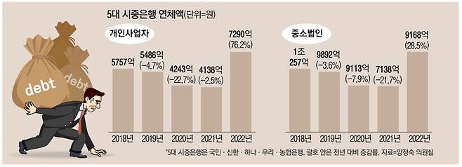 개인사업자를 제외한 중소법인 연체액은 2018년 1조257억원에서 2021년 7138억원으로 매년 꾸준히 줄었지만 작년엔 전년보다 28.5% 증가한 9168억원을 기록했다. 은행들은 한계기업 증가로 인한 중소법인 연체에도 촉각을 곤두세우고 있다.