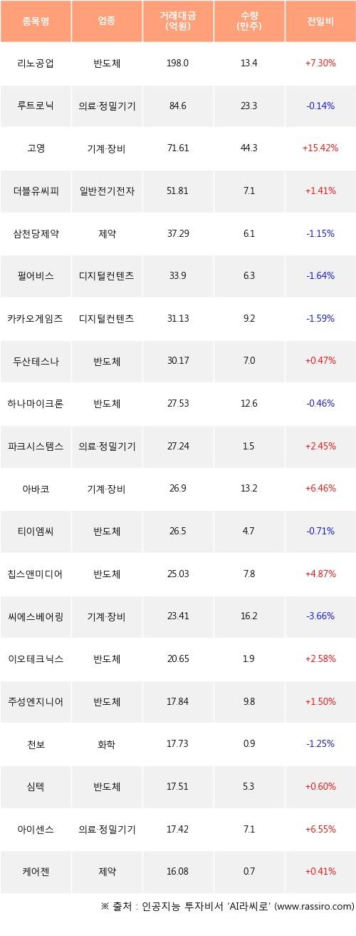 기관 투자자의 순매수 상위 20개 종목은 리노공업, 루트로닉, 고영, 더블유씨피, 삼천당제약, 펄어비스, 카카오게임즈, 두산테스나, 하나마이크론, 파크시스템스등이다.