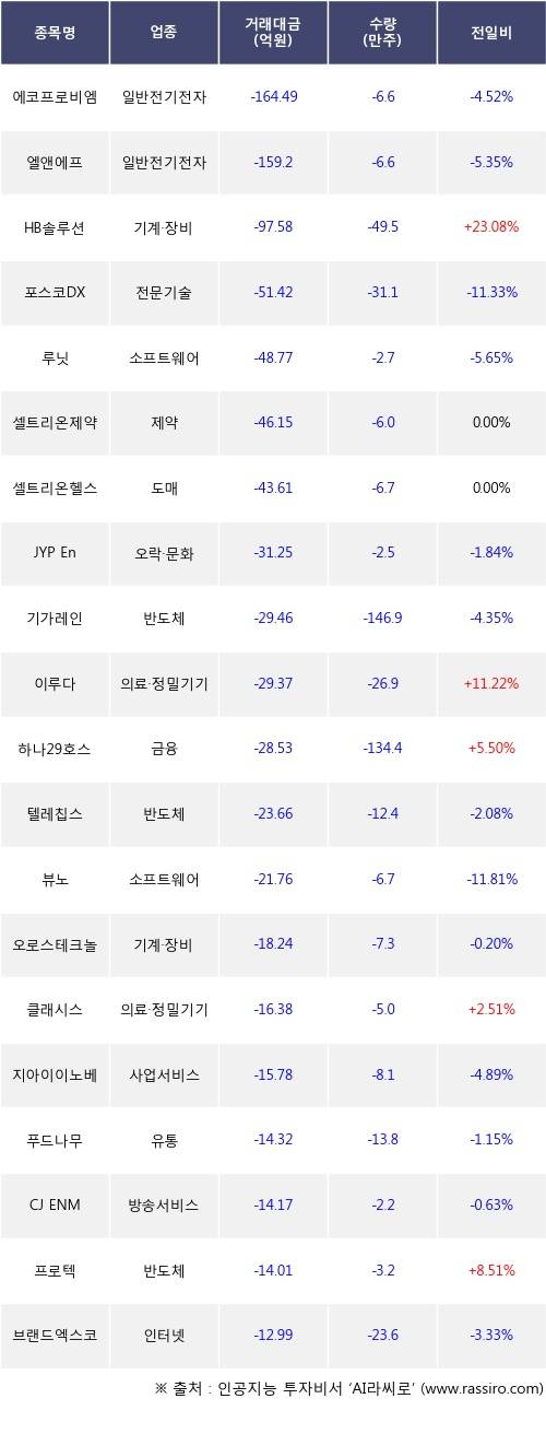 기관 투자자의 순매도 상위 20개 종목은 에코프로비엠, 엘앤에프, HB솔루션, 포스코DX, 루닛, 셀트리온제약, 셀트리온헬스케어, JYP Ent., 기가레인, 이루다등이다.