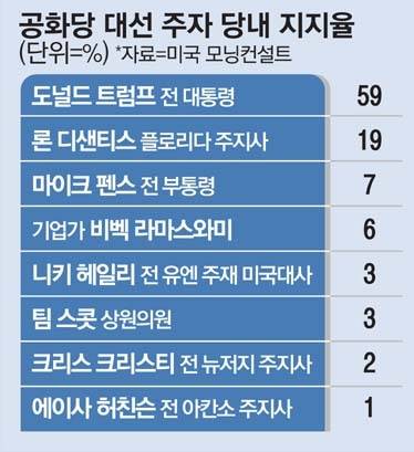 트럼프 전 대통령은 공화당 내 경선에서 과반 이상(59%) 지지를 얻으면서 압도하고 있다. 2위 주자인 디샌티스 주지사는 19% 지지율을 얻는 데 그쳤다. 이어 마이크 펜스 부통령 7%, 기업가 비벡 라마스와미 6%, 니키 헤일리 전 유엔주재 미국대사와 공화당 유일의 흑인 상원의원인 팀 스콧이 각각 3% 등 순이다.