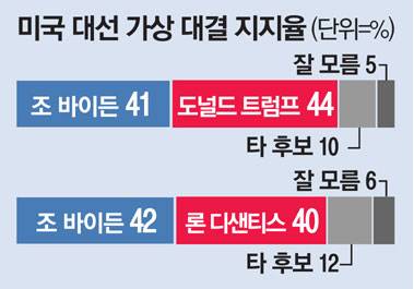 디샌티스 주지사는 바이든 대통령과 대선에서 대결할 경우 각각 40%대 42% 지지율을 얻었다. 디샌티스 주지사의 경우 대선 본선 경쟁력에서도 바이든 대통령에게 밀리는 형국이다.