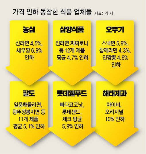 라면업체들도 이날 가격 인하 행렬에 동참했다. 오뚜기는 다음 달 1일부로 참깨라면, 진짬뽕, 스낵면 등 라면 15종 가격을 평균 5%대로 인하한다고 밝혔다. 대형마트 기준으로 스낵면 5개입은 3380원에서 3180원으로 5.9%, 참깨라면 4개입은 4680원에서 4480원으로 4.3% 각각 내린다. 팔도도 일품해물라면, 왕뚜껑봉지면 등 라면 11개 제품을 평균 5.1% 내린다. 이로써 라면 주요 4사(농심, 삼양식품, 오뚜기, 팔도) 모두 가격을 인하하게 됐다.