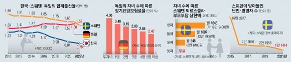 스웨덴도 OECD 평균 수준의 출산율을 유지하고 있지만 코로나19 이후 출산율 하락을 경험하며 새로운 정책을 모색 중이다. 스웨덴의 합계출산율은 2020년 1.66명, 2021년 1.67명, 지난해는 23년 만에 최저 수준인 1.52명까지 떨어졌다. 원인으로는 노동시장에서의 성별 불균형과 같은 ‘고용의 질’이 꼽힌다. 여성이 아이를 낳고 일할 수 있도록 양성평등을 이뤘지만, 육아휴직 후 10년이 지나지 않은 여성 노동자의 50%가 비정규직이다. 보수도 동일 직종 남성보다 10% 낮다. 스웨덴 사회보험청의 니클라스 로프그렌 대변인은 “여성 실업률이 높으면 출산율이 떨어진다”며 “육아휴직 90일을 쓰는 비율이 남성은 아직 30%에 못 미친다”고 말했다.