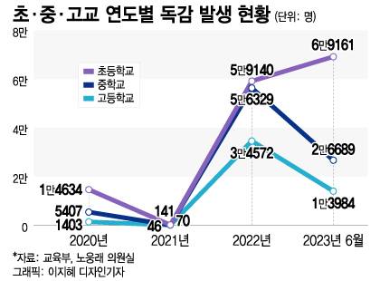 노웅래 더불어민주당 의원이 교육부로부터 제출받은 자료에 따르면 올해 상반기(6월 15일 기준) 교육부 교육행정정보시스템 나이스(NEIS)를 통해 신고된 초·중·고교의 독감 환자 수는 11만148명에 달한다. 초등학생이 6만 9161명으로 가장 많고 중학생 2만6689명, 고등학생 1만3984명, 특수학교 학생 314명 순이다. 독감 유행이 언제 멈출지 알 수 없는 데다, 매년 가을 이후 감염병이 확산한다는 점을 고려하면 올해 학생 독감 환자는 지난해(약 15만명)를 넘어설 것으로 전망되고 있다. 초등학생 독감 환자는 이미 지난해 총환자 수(5만9140명)를 뛰어넘은 상황이다.