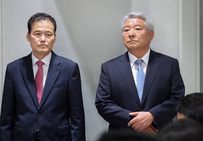 | ▲ 김영호 통일부 장관 후보자와 김홍일 권익위원장 내정자 김영호 통일부 장관 후보자(왼쪽)와 김홍일 국민권익위원장 내정자가 29일 서울 용산 대통령실 청사에서 김대기 대통령 비서실장의 장차관 인선발표 브리핑에 배석하고 있다. |