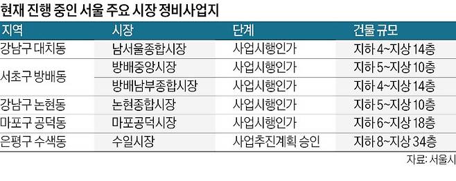 강남·서초구 등에서도 시장 재정비사업이 한창이다. 알짜 부지 시장을 재정비해 주상복합으로 개발한다는 소식에 실수요자의 관심이 크다. 지난 3월 사업시행인가를 받은 서초구 방배동 방배남부종합시장은 최고 14층 높이의 주상복합으로 거듭날 계획이다. 같은 동 방배중앙시장은 최고 10층 건물로 사업시행인가를 받았다. 강남구에서는 대치동 남서울종합시장과 논현동 논현종합시장이 각각 14층, 10층 규모의 주상복합으로 재탄생할 전망이다. 이처럼 서울에서 사업시행인가 단계에 접어든 시장은 열 곳이다. 사업추진계획 승인 단계인 시장 다섯 곳과 서울시에 정비사업을 신청(협의 진행)한 시장 열 곳 등이 주상복합으로 변신을 준비 중이다.