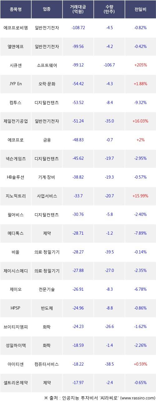 기관 투자자의 순매도 상위 20개 종목은 에코프로비엠, 엘앤에프, 시큐센, JYP Ent., 컴투스, 제일전기공업, 에코프로, 넥슨게임즈, HB솔루션, 지노믹트리등이다.