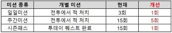 일일 미션, 주간 미션, 시즌 패스의 개별 임무 달성 조건이 현재 대비 완화된다. 아래 표는 예시이며 각 미션별 전체적인 달성 조건이 조정될 예정으로 상세한 조정 사항은 7월 6일 업데이트 노트로 다시 안내한다.