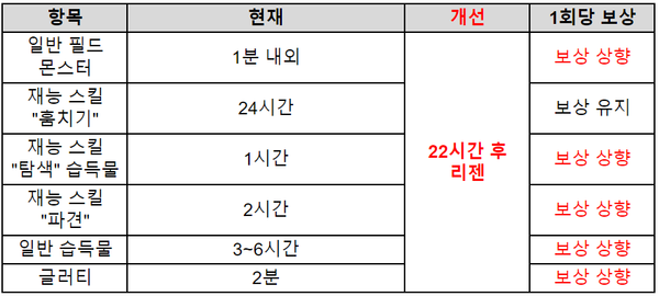 현재 각 리젠 콘텐츠들의 시간이 달라서 유저들의 반복 플레이 시간을 강제하고 있다. 전체 리젠 시간을 22시간 기준 1회 리젠으로 변경하고 그에 맞춰 1회당 보상 수량을 적정 수량으로 조정해 전체적인 게임 플레이 타임에 대한 부담을 낮출 계획이다. 리젠 시간이 변경되는 항목은 아래와 같다.