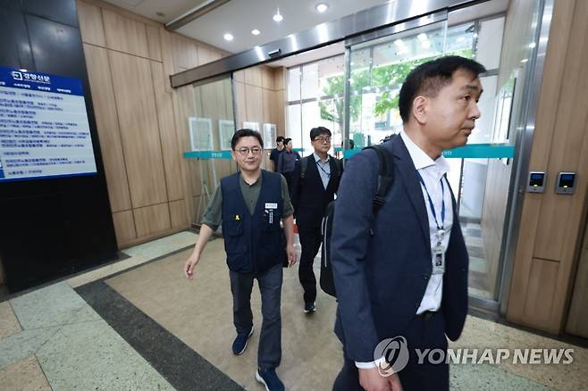 (서울=연합뉴스) 홍해인 기자 = 고용노동부 관계자들이 30일 서울 중구 정동 민주노총에서 국고보조금 지급 실태 확인을 위한 현장 조사를 나와 민주노총 사무실로 들어가고 있다. 2023.6.30