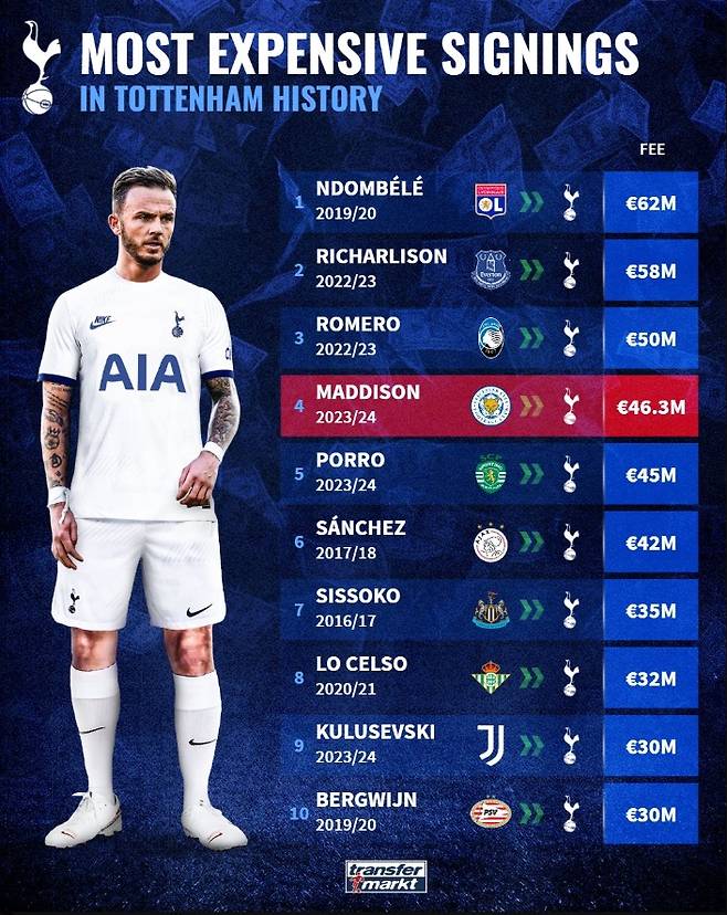 '트란스퍼마르크트'에 따르면, 그동안 토트넘 역대 이적료 순위에서 4위 자리는 지난 1월 4500만 유로(약 644억원)에 영입된 풀백 페드로 포로가 차지하고 있었지만 매디슨이 포로를 5위로 밀어내고 대신 4위에 올랐다.
