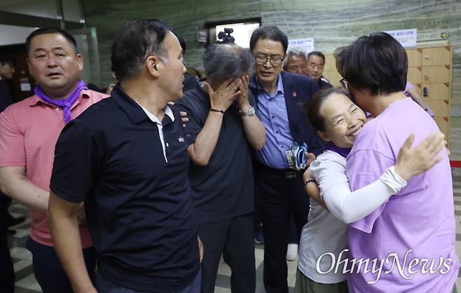 ▲ 이태원 참사 특별법 제정을 촉구하며 11일째 단식 농성 중인 고 이주영씨의 아버지 이정민씨와 유가족들이 30일 오후 서울 여의도 국회 본회의에서 10.29 이태원 참사 피해자 권리보장과 진상규명 및 재발방지를 위한 특별법안에 대한 신속처리안건(패스트트랙) 지정동의의 건이 통과에 기뻐하며 회의장을 나서고 있다.ⓒ 유성호