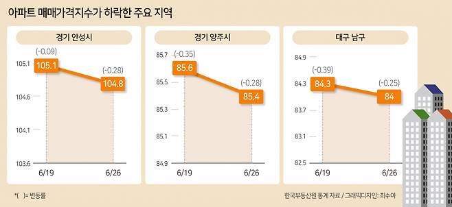 전주 대비 아파트 매매가격지수 하락폭이 큰 지역은 경기 안성시(-0.28), 경기 양주시(-0.28), 부산 영도구(-0.27), 대구 남구(-0.25), 충남 홍성군(-0.2), 충남 당진시(-0.2) 등 순이었다.