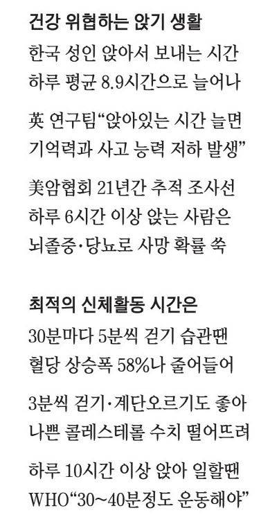 스웨덴 카롤린스카연구소도 비슷한 연구를 내놓았다. 연구팀은 지난해 8월 30분마다 3분씩 걷거나 계단을 오르면 하루 종일 앉아 있는 것에 비해 나쁜 콜레스테롤(LDL)과 혈당 수치가 떨어진다는 분석을 내놨다. 핀란드 투르쿠대 연구팀은 하루에 1시간씩 앉아 있는 시간을 줄이면 공복 혈당 등 심장 대사지표와 간 기능 수치가 개선된다는 연구를 지난해 5월 공개했다. 과학자들은 사무직 등 하루 종일 앉아 있을 가능성이 높은 직장인들에게 업무 시간에 '최대한 몸을 움직여라' '가벼운 활동이라도 안 움직이는 것보다 낫다는 것은 의심의 여지가 없다'는 조언을 내놓고 있다.