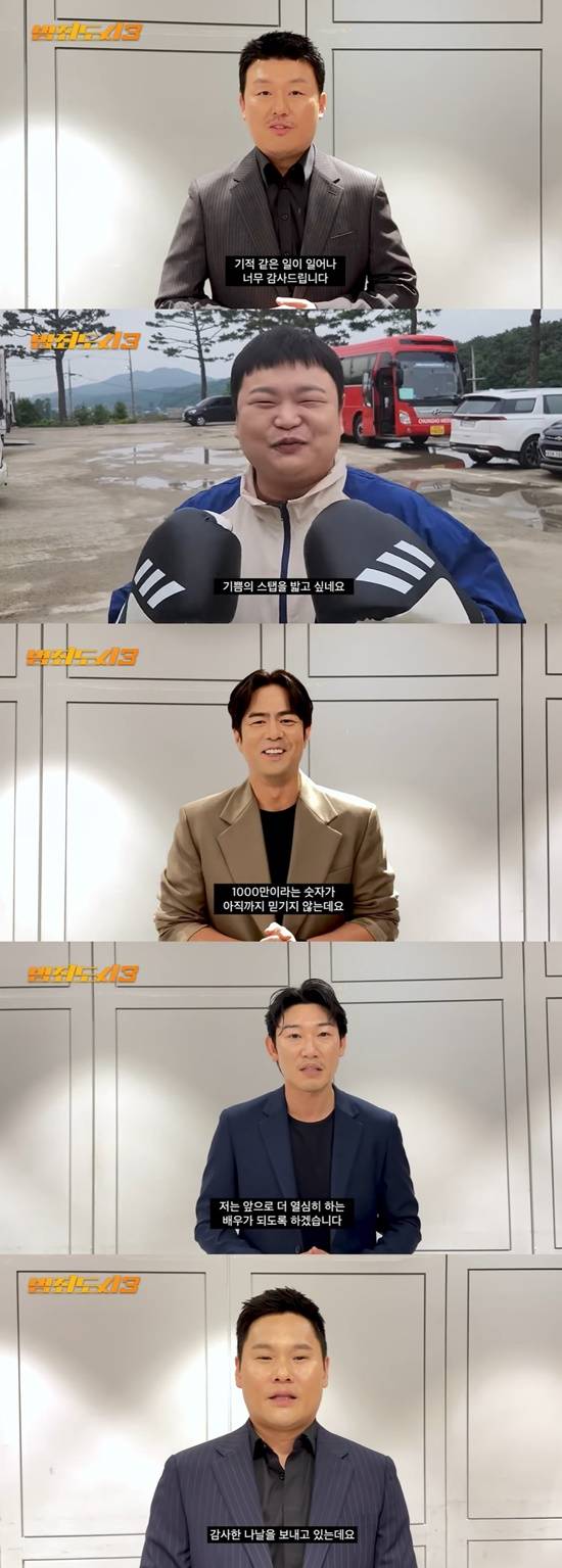 괴물형사 마석도 역의 마동석은 "천만 관객 여러분이 없었다면 '범죄도시' 시리즈는 존재하지 못했을 것이다. 각 나라를 대표하는 영화 시리즈 중, 한국을 대표하는 영화 시리즈는 '범죄도시'라고 자부할 수 있도록 배우와 제작진들이 최선을 다해 만들었다. 내년에 선보일 '범죄도시4' 역시 관객 여러분이 더욱 재미있게 보실 수 있도록 만반의 준비를 하도록 하겠다"며 거듭 감사 인사를 전했다.