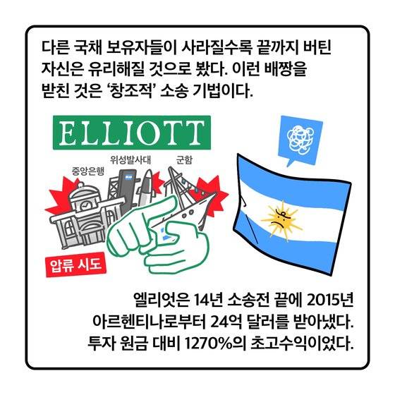 이런 배짱을 받친 것은 ‘창조적’ 소송 기법이다. 엘리엇은 아르헨티나 중앙은행의 준비금, 연기금은 물론이고 미국 소재 아르헨티나 위성발사대, 아프리카 가나에 입항한 군함까지 압류를 시도했다(군함은 실제로 두 달간 억류됐다). 성공하진 못했지만, 아르헨티나에 압박을 주기엔 충분했다. 엘리엇은 14년 소송전 끝에 2015년 아르헨티나로부터 24억 달러를 받아냈다. 투자 원금 대비 1270%의 초고수익이었다.