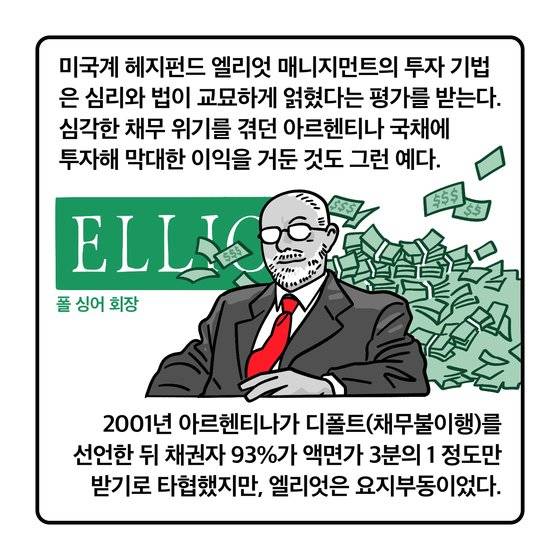미국계 헤지펀드 엘리엇 매니지먼트의 폴 싱어 회장은 명문 로체스터대 심리학과와 하버드대 로스쿨을 나왔다. 그래서인지 그의 투자 기법은 심리와 법이 교묘하게 얽혔다는 평가를 받는다. 심각한 채무 위기를 겪던 아르헨티나 국채에 투자해 막대한 이익을 거둔 것도 그런 예다.