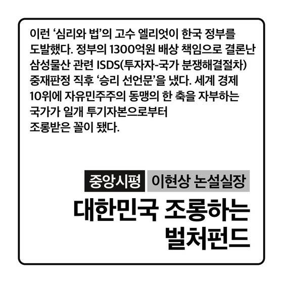 이런 ‘심리와 법’의 고수 엘리엇이 한국 정부를 도발했다. 정부의 1300억원 배상 책임(이자 및 소송비용 포함)으로 결론 난 삼성물산 관련 ISDS(투자자-국가 분쟁해결절차) 중재판정 직후 ‘승리 선언문’을 냈다. “아시아에서 주주행동주의 투자회사가 최고위층의 부패 범죄행위에 대해 승리한 최초의 분쟁 사례”라는 자랑과 함께 “한국 정부가 이번 판정을 교훈 삼아 부패와 계속 싸워나가기 바란다” 같은 주제넘은 충고까지 했다. 심지어 윤석열 대통령과 한동훈 법무부 장관 이름까지 들먹였다. “(이들의) 검찰 재직 시절 수사로 위법이 입증된 사건.” 세계 경제 10위에 자유민주주의 동맹의 한 축을 자부하는 국가가 일개 투기자본으로부터 조롱받은 꼴이 됐다. 자기 땅에 공장을 지으라는 미국 정부 요구에 사업 기밀 공개 압박까지 받으면서도 냉가슴만 앓는 우리 기업 처지와 대비되지 않는가. 도를 넘는 방자함으로 우리 정부의 평정심을 흩트려 놓겠다는 전략인가.