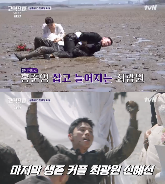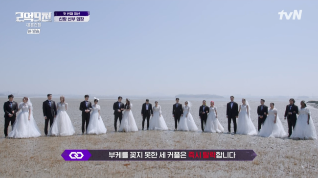 첫번째 미션은 신랑 신부 입장이었다. 웨딩드레스와 턱시도를 입은 10커플은 갯벌을 건너 화병에 부케를 꽂아야 했다. 무려 3커플이 떨어진다는 고지에 모두들 놀라는 모습을 보였다. 커플들은 “오징어 게임 아니야?”라며 충격받은 모습을 보였다.