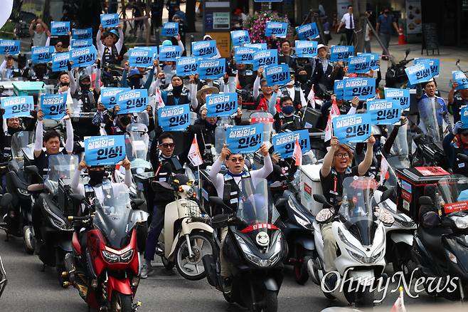| ▲ 오토바이를 탄 배달노동자들이 '실질임금 인상' 피켓을 들고 구호를 외치고 있다. |