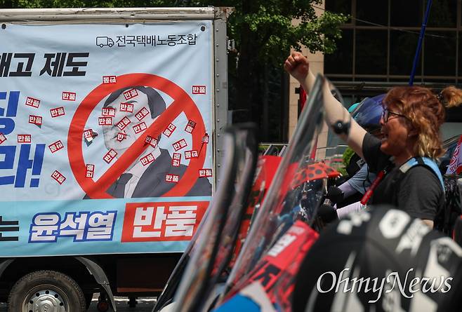 민주노총 총파업 돌입 첫날인 3일 오후 서울 광화문네거리에서 '특수고용노동자 실질임금인상! 노조법 2, 3조 개정! 윤석열 퇴진! 서비스연맹 특수고용노동자 파업대회'가 열렸다. 택배상자에 붙은 윤석열 대통령 그림에 '반품' 스티커가 붙어 있다.