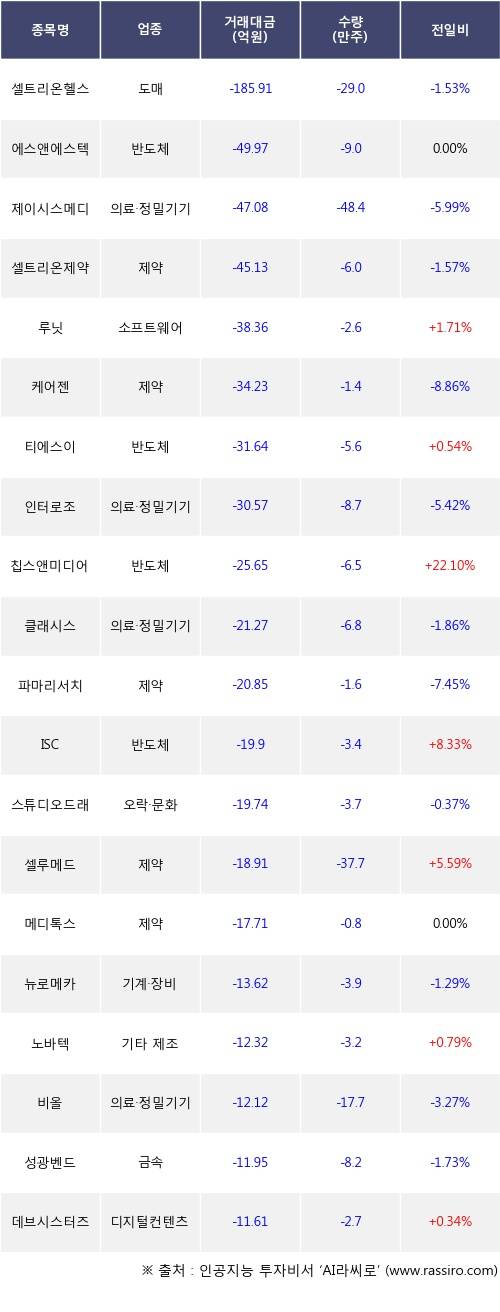 기관 투자자의 순매도 상위 20개 종목은 셀트리온헬스케어, 에스앤에스텍, 제이시스메디칼, 셀트리온제약, 루닛, 케어젠, 티에스이, 인터로조, 칩스앤미디어, 클래시스등이다.