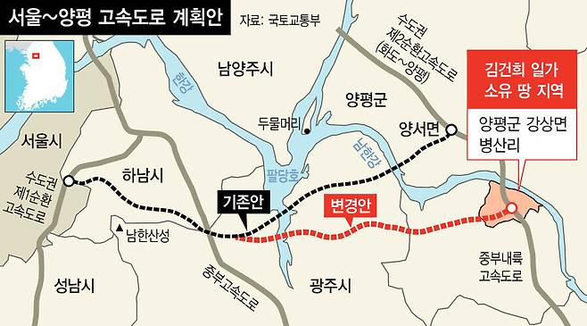 국토교통부가 예비타당성조사(예타)를 통과한 서울-양평 고속도로(고속국도) 종점을 윤석열 대통령 처가 소유 땅 근처로 갑작스레 변경해 논란이 커진 가운데, 고속도로가 시작되는 하남시에서도 교통 정체를 이유로 '시작점'을 변경해달라고 국토부에 건의했지만 수용되지 않은 것으로 확인됐다.
