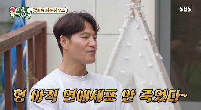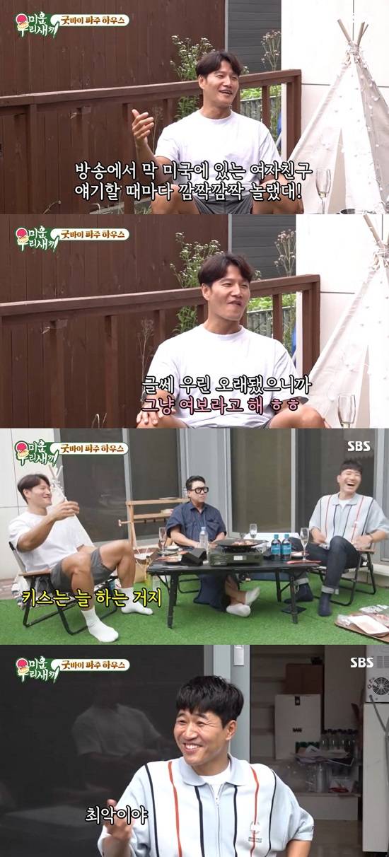 이어 김종국은 "우린 사귄지 오래돼서 '여보'라고 애칭을 부른다. 마지막 키스는 없다. 늘 하는 거다. 지금도 한다"며 뽀뽀 시늉까지 해 경악을 불러일으켰다.