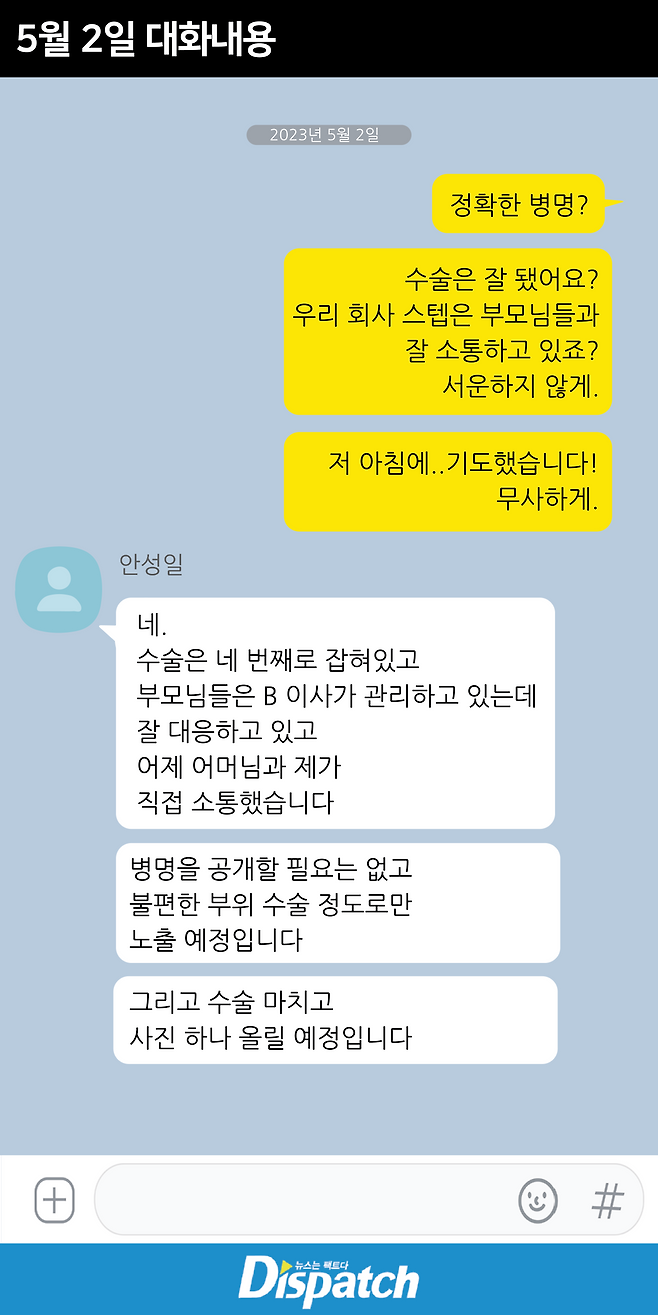지난 5월 2일, 아란이 수술을 했다. B씨가 전홍준 대표에게 보낸 카톡.