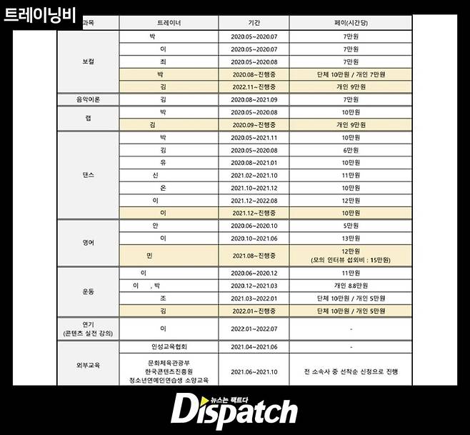 실제로, 피프티 피프티는 보컬, 음악이론, 랩, 댄스, 영어, 운동, 연기까지 과목별로 레슨을 받았다. 트레이닝 비용으로 매월 2,000~3,000만 원 정도 내보냈다.