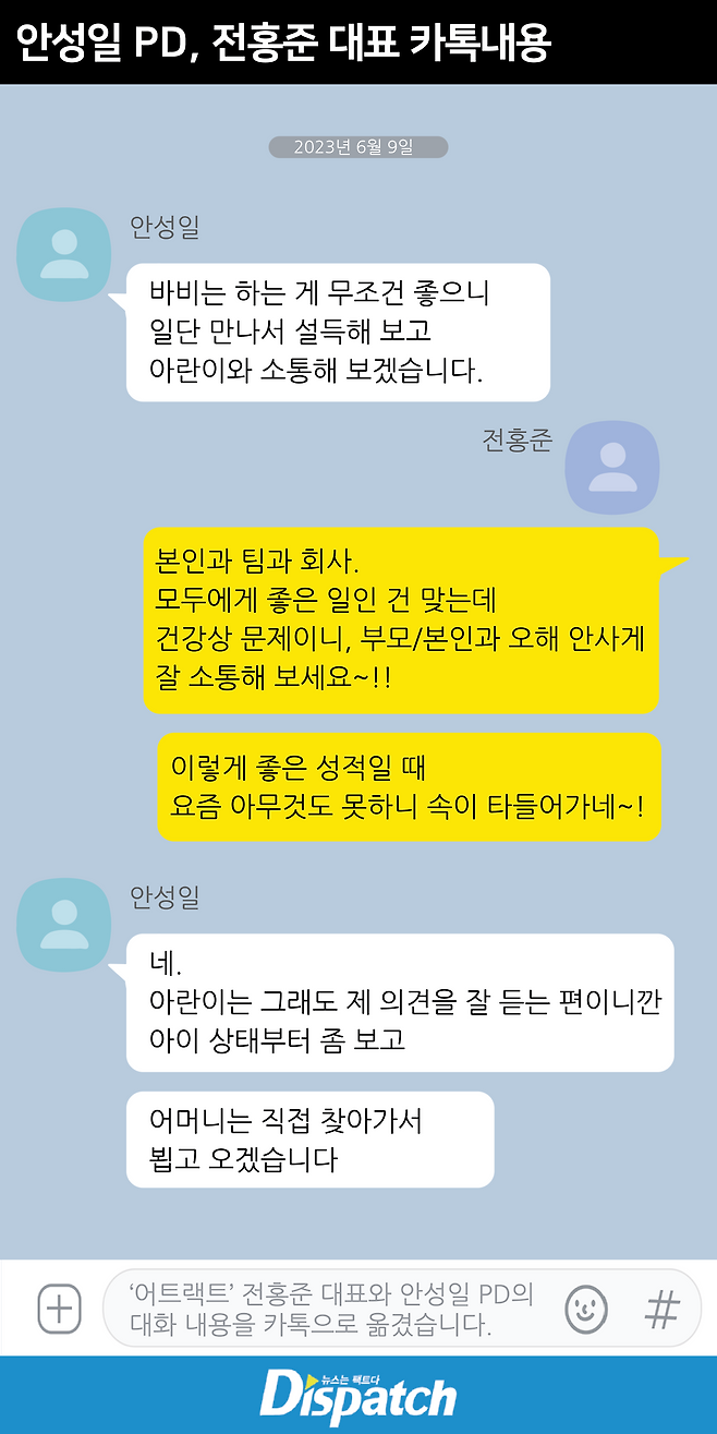 여기서 잠깐, 4월 26일 전홍준 대표와 안성일 PD의 카톡 대화다.