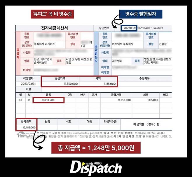 물론 바이아웃이 불법은 아니다. 다만, 안성일이 그 돈을 돌려받았다면 상황은 달라진다. '디스패치'는 '어트랙트'가 지난 3월에 발행한 세금계산서를 입수했다.