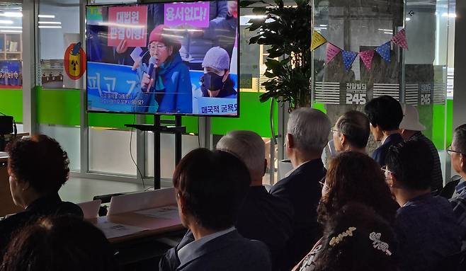 | ▲ 3일 강제동원 피해자의 용기 있는 투쟁과 함께하는 ‘역사정의를 위한 시민모금’ 기자회견장에서 참석자들이 양금덕 할머니의 활동 영상을 시청하고 있다. |