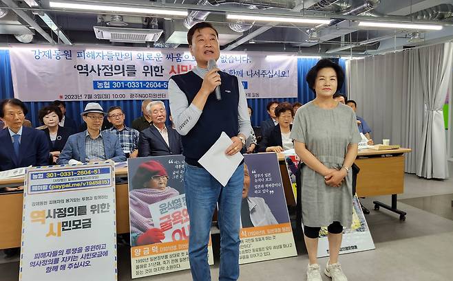 | ▲ 사단법인 일제강제동원시민모임과 광주·전남지역 81개 시민·사회단체들이 지난 3일 광주광역시에서 강제동원 피해자의 용기 있는 투쟁과 함께하는 ‘역사정의를 위한 시민모금’ 동참을 호소하고 있다. 이날 기자회견에서 우리나라 정부의 ‘제3자 변제’를 거부한 강제동원 피해자 양금덕 할머니의 아들 박상운씨와 이춘식 할아버지의 딸 고은씨가 지지 발언을 하고 있다. |