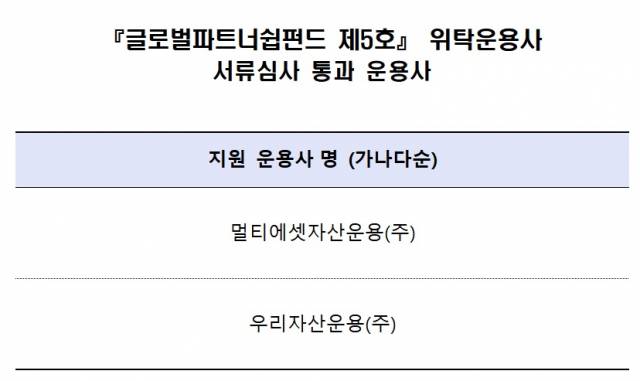 4일 투자은행(IB) 업계에 따르면 산업은행의 글로벌 파트너십 펀드 출자사업에서 멀티에셋자산운용과 우리자산운용이 서류심사를 통과했다.