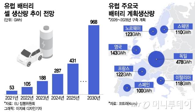 유럽의 다른 나라들도 비슷하다. LG에너지솔루션(폴란드), 삼성SDI·SK온(헝가리) 등이 주력하는 동유럽뿐 아니라 지가·인건비 등이 비싼 서유럽에도 신생 배터리기업이 우후죽순 늘어난다. 프라이어·모로우 등이 자리한 노르웨이(125GWh), 40GWh 규모의 첫 배터리 공장이 가동을 시작한 프랑스(130GWh), 스텔란티스의 글로벌 5대 기가팩토리 중 하나가 들어서는 이탈리아(80GWh) 등 2026~2028년까지 주요국에 수 백 GWh 규모의 배터리 공장 설립이 예고됐다. 계획물량이긴 하지만, 종전 EU가 예상한 2030년 968GWh를 넘어섰다.